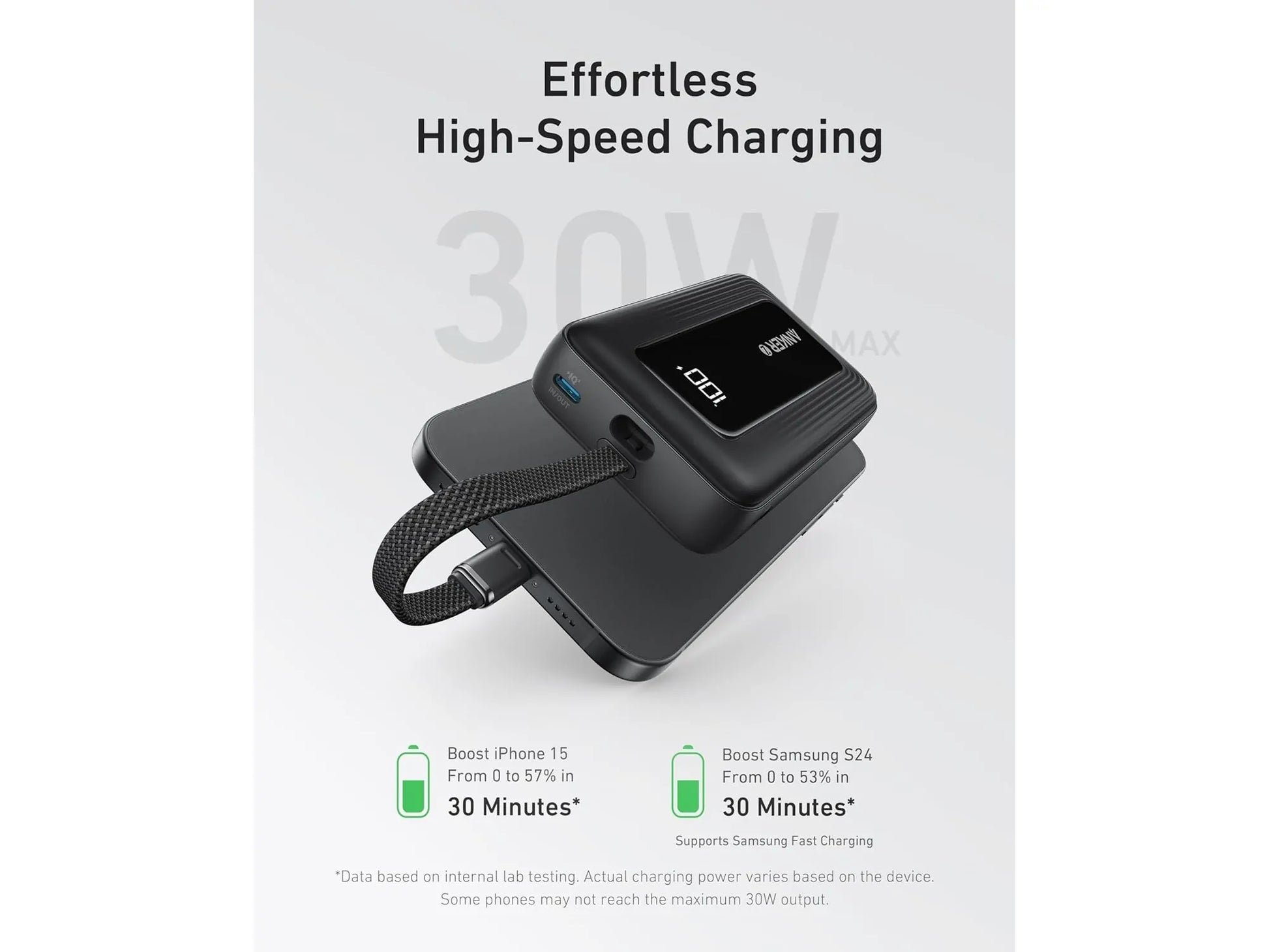 Anker Zolo Power Bank, 20,000mAh 30W High-Speed Portable Charger with Built-In USB-C Cable