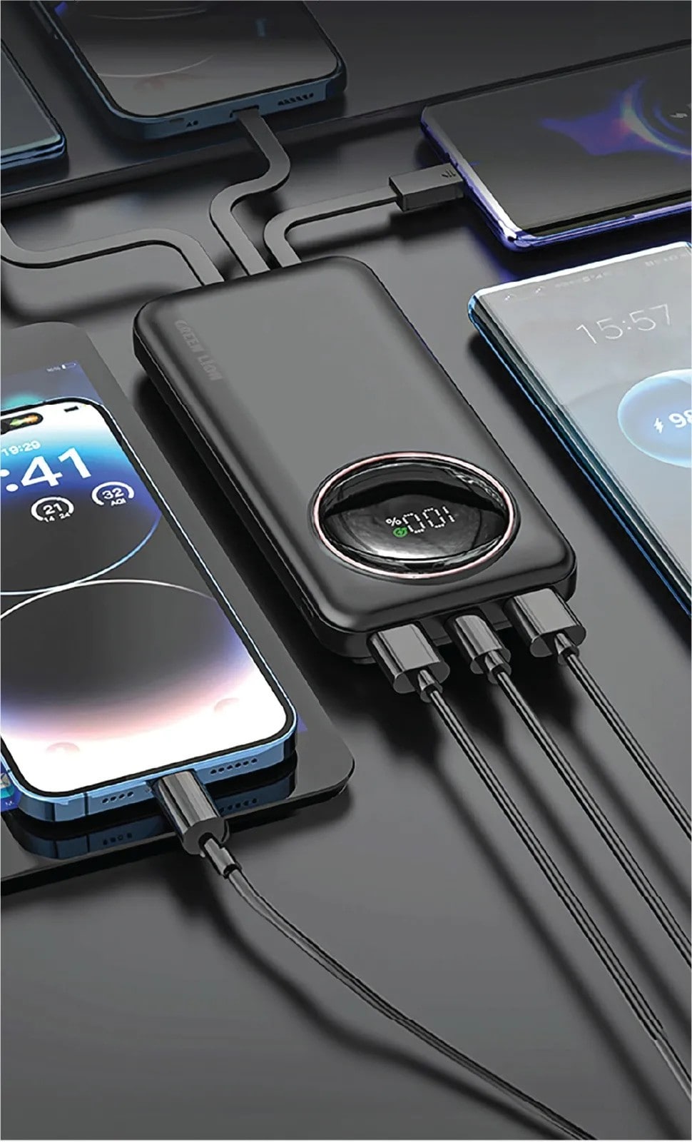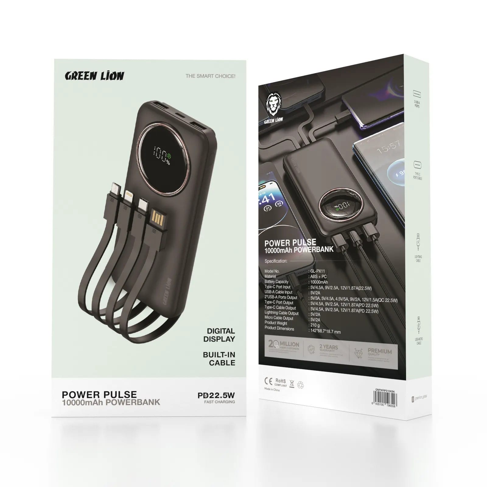 Stay powered up on the go with the Green Lion Power Pulse 10000 mAh Powerbank PD 22.5W, a compact yet powerful charging solution designed for ultimate versatility and speed. Equipped with 6 output options including Type-C, USB-A, Lightning, and Micro cables, this powerbank supports fast charging up to 22.5W via both PD and QC protocols. The dual input functionality (Type-C and USB-A) ensures quick recharging of the powerbank itself, while the built-in cables eliminate the need to carry extras. Its smart digital display keeps you informed of the battery status in real-time, and multiple safety protections offer peace of mind during every charge. Perfect for powering all your devices efficiently, anytime, anywhere.