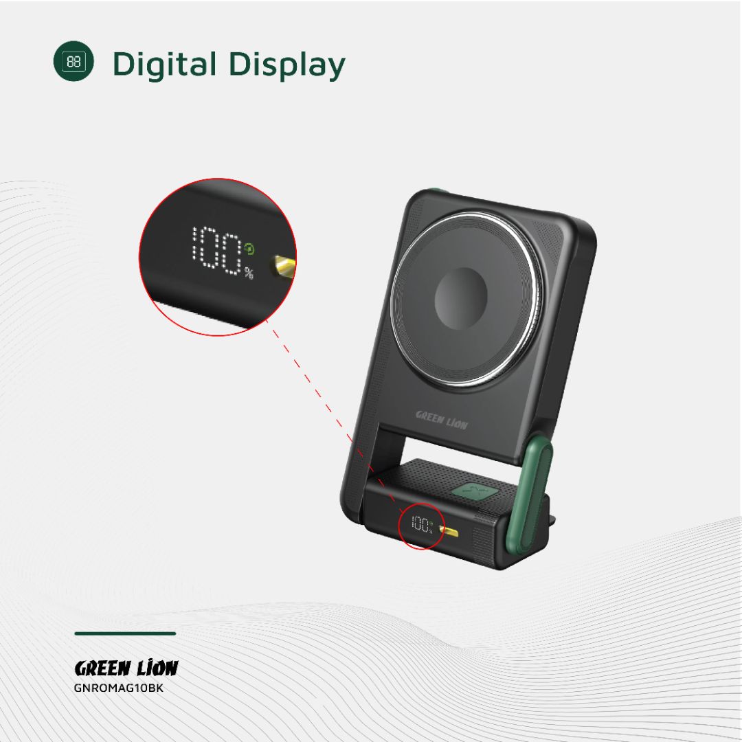 The Green Lion Rotex is a powerful and versatile 10,000mAh power bank designed to keep all your devices charged on the go. With PD 22.5W fast charging, dual Type-C outputs, and MagSafe compatibility, it offers seamless wired and wireless charging. The built-in rotating bracket adds convenience for hands-free use, while the dedicated iWatch charger ensures your smartwatch stays powered alongside your phone and other devices.