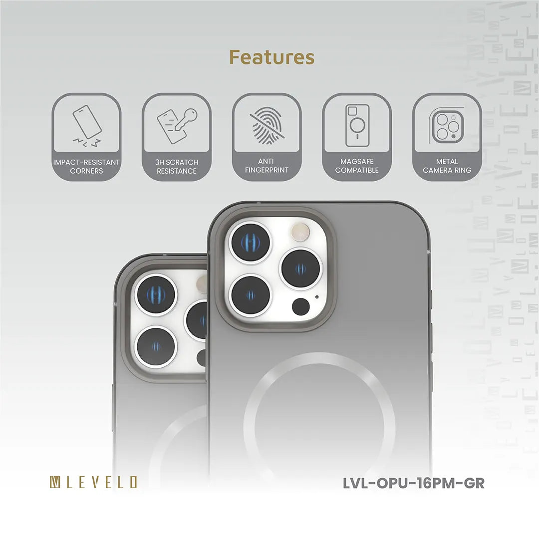 The Levelo Opulis Case is designed to combine premium protection with everyday elegance. Built from durable material and reinforced with impact-resistant corners, it keeps your phone safe from accidental drops and scratches. The anti-fingerprint finish ensures your case stays clean and stylish, while the strong MagSafe magnet delivers secure wireless charging and accessory compatibility. A premium metal camera ring adds both protection and a sleek finish, making this case a perfect blend of function and design.